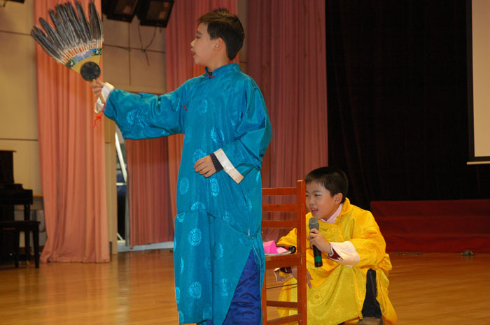 四年十一班的肖敬洲和张轩睿同学在表演双簧《考词风波》
