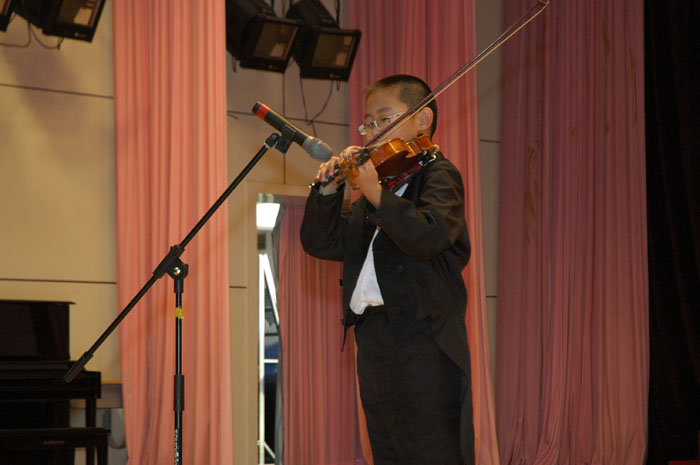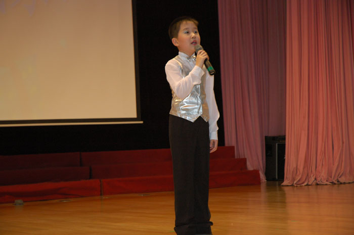 四年十七班的温智天同学在表演诗朗诵《沁园春・雪》